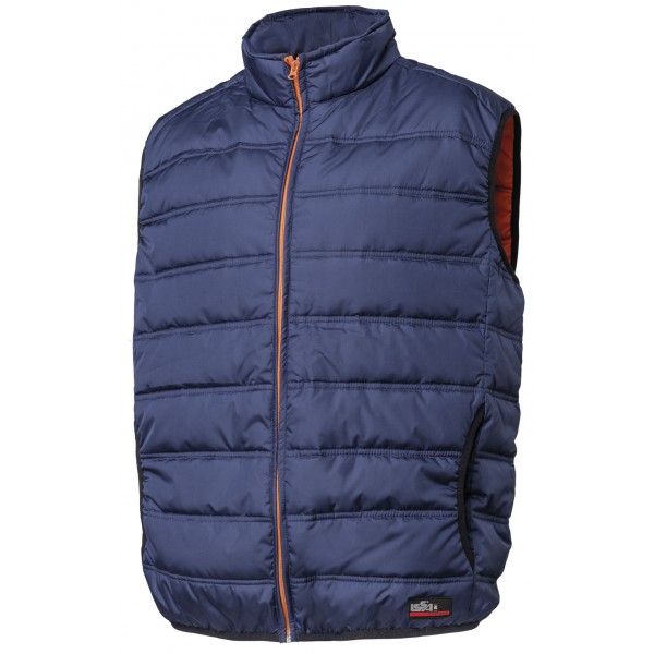 Gilet ISSA Hugo 04008 in poliestere pongee spalmato AC. Disponibile dalla taglia S alla 3XL, in colore blu con interno arancio. Capo imbottito con due tasche esterne e due tasconi interni, chiusura con elastico in vita.