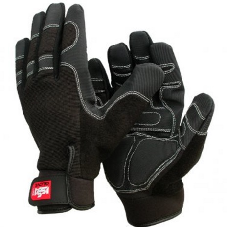 Pelle sintetica. Presa sportiva antiscivolo sul palmo, imbottiture di gel shock assorbente e antivibrazione sul palmo.Campi di impiego: utilizzo elettro utensili con vibrazioni, necessità di presa asciutta, mountain bike e altri sport.