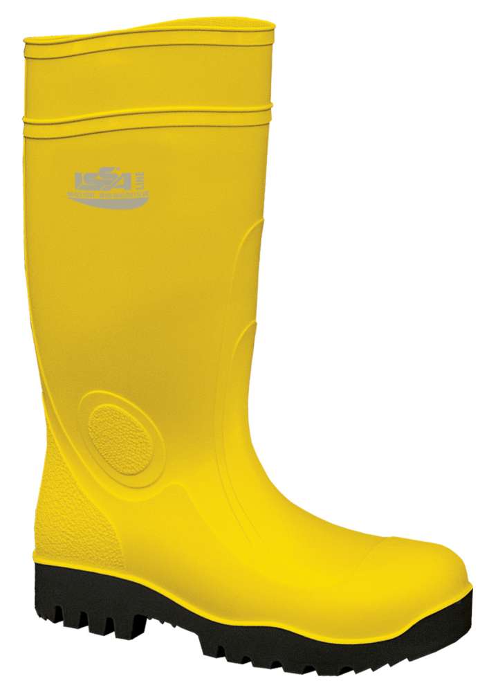 Stivale da lavoro in gomma nitrilica (PVC nitrilico) con puntale e lamina in acciaio, suola carrarmato, taglio ergonomico e tre tipi di rifinitura per una migliore pulitura. Inserto sul tallone per facilitare la svestizione.