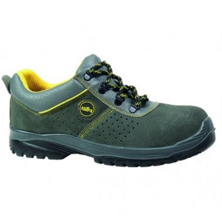 Scarpa antinfortunistica bassa con tomaia scamosciata traforata, suola in PU bidensità antiscivolo, parte frontale priva di cuciture per ridurre il rischio rotture.