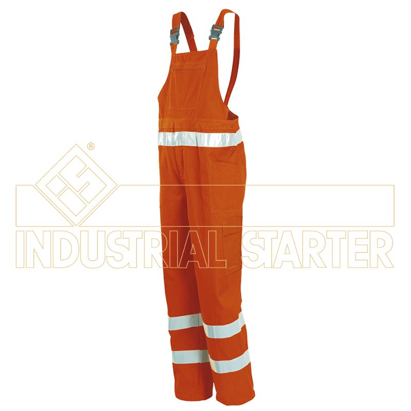 Tasche applicate sul davanti, tasca posteriore applicata e chiusa con bottone e tasca porta metro, tasca sulla pettorina chiusa con cerniera. Due aperture laterali con bottone per facilitare la vestizione, elastico in vita, tasca laterale con chiusura con velcro e porta badge. Bretelle regolabili con fibbie in plastica. Bande rifrangenti in vita e sul fondo. Chiusura davanti con bottoni ricoperti da patta.