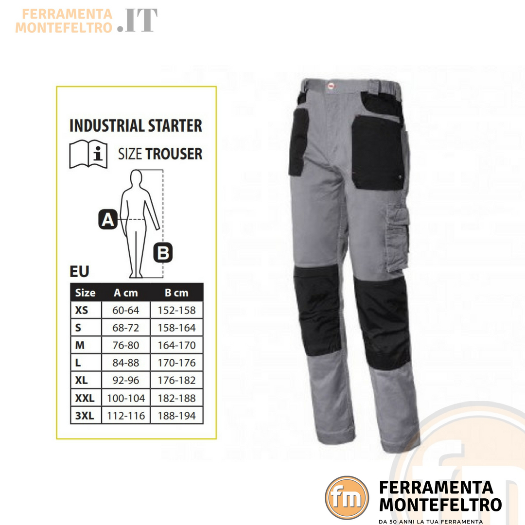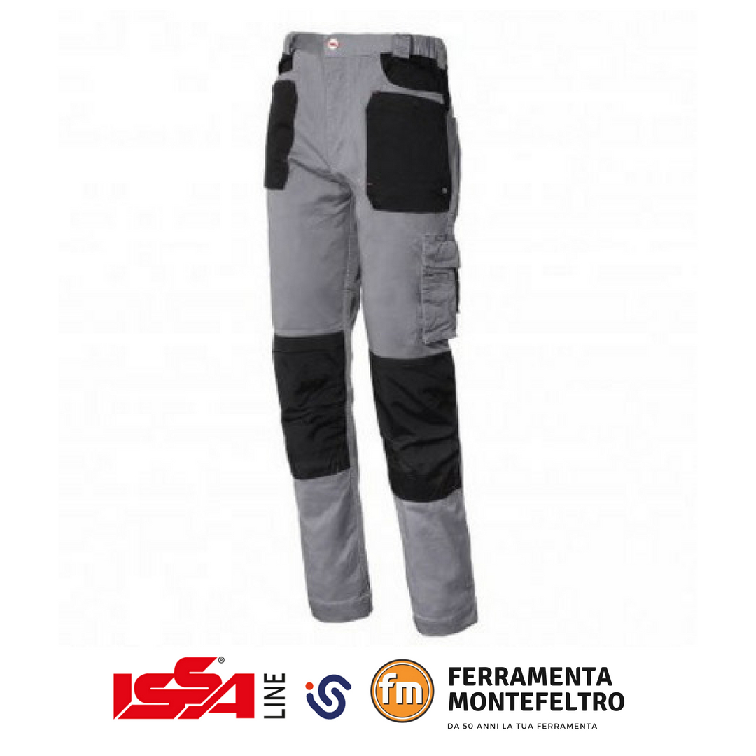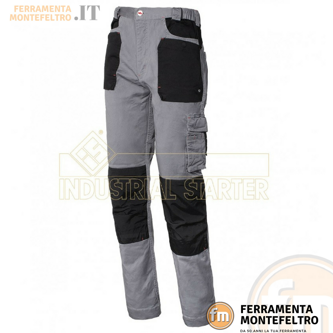 Con elastico in vita, tascone laterale e tascone porta metro, porta ginocchiere in tessuto rinforzato ed impermeabile