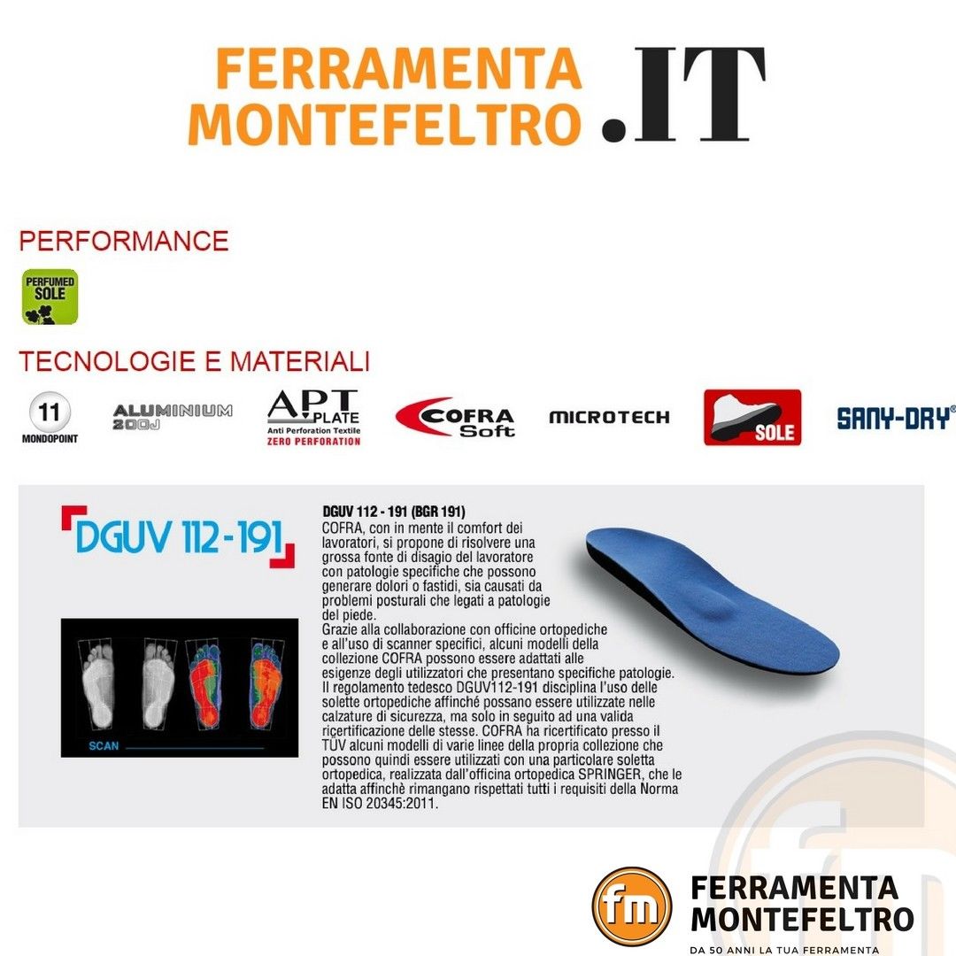 SOLETTA: COFRA SOFT, anatomica, antistatica, forata, in poliuretano profumato, soffice e confortevole; il disegno dello strato inferiore garantisce assorbimento dell’energia d’impatto; lo strato superiore assorbe il sudore e lascia il piede sempre asciutto