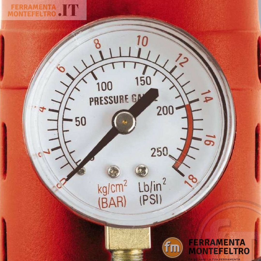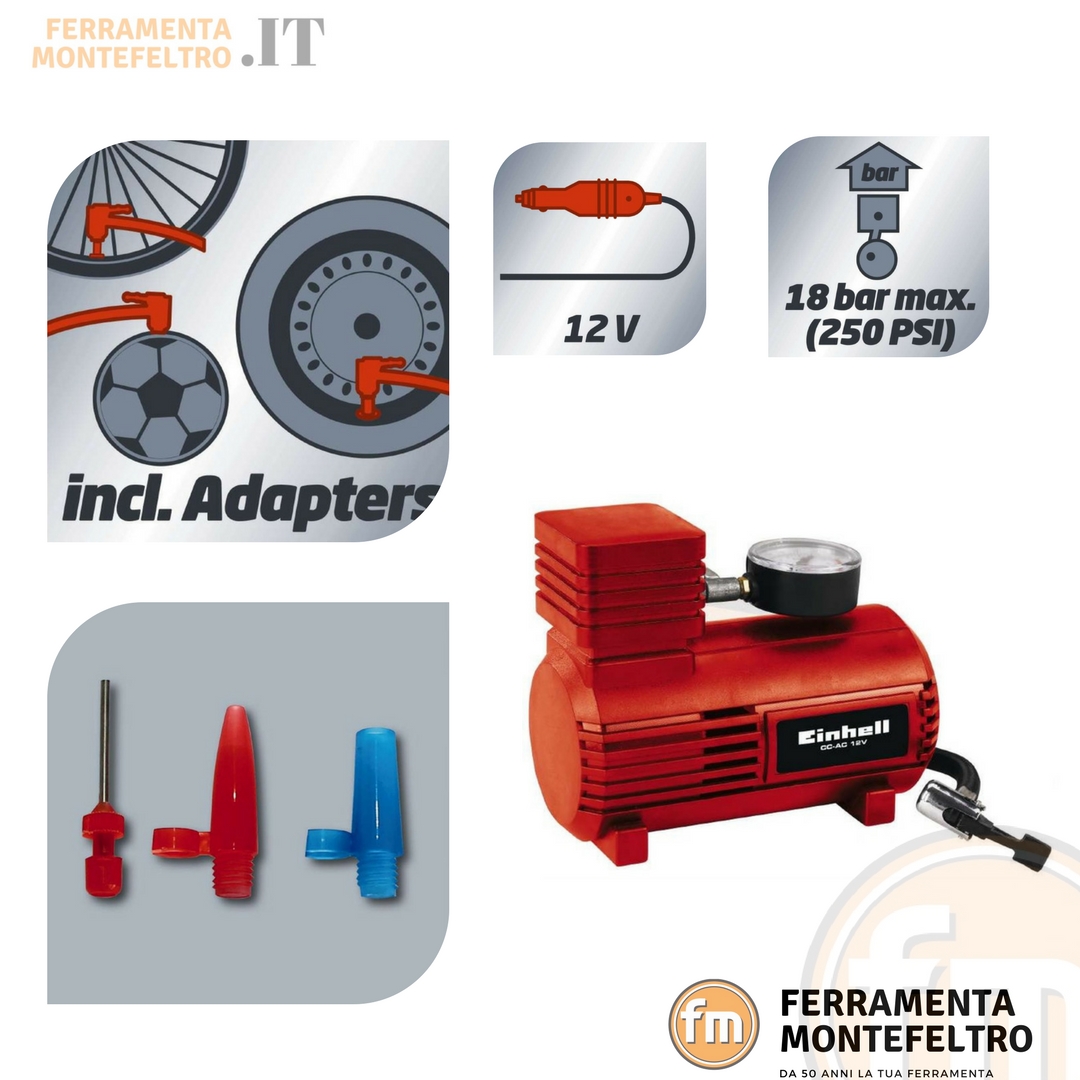Grazie al collegamento a 12 volt con la presa dell’accendisigari e al cavo di adduzione da 2,9 m, si presta a molti lavori che richiedono l’utilizzo di aria compressa, come per es. il gonfiaggio di pneumatici di auto, motociclette e biciclette o di palloni e materassini gonfiabili, che possono essere eseguiti rapidamente e in qualsiasi luogo. Il manometro integrato consente di leggere la pressione dell’aria trasferita da 0 a un massimo di 18 bar.