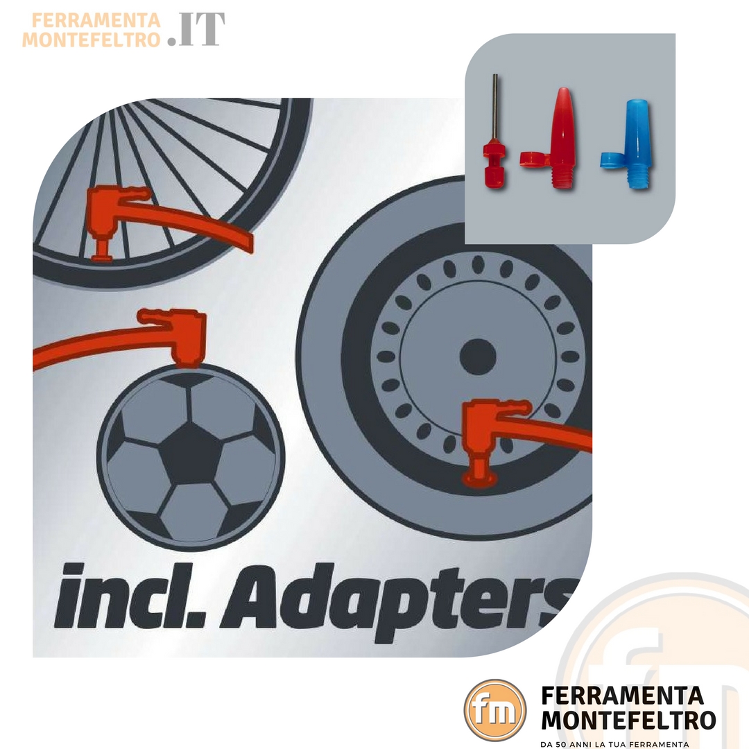 I 3 adattatori supplementari (adattatore per palloni gonfiabili, materassini gonfiabili e palle) consentono un uso versatile del compressore.