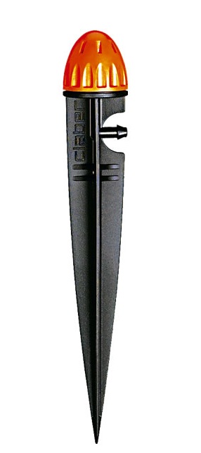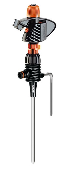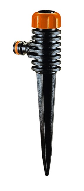 Testina irrigatore a battente per irrigazione a settori da 0° a 360° oppure a rotazione continua, montata su stabile picchetto a doppio puntale.
