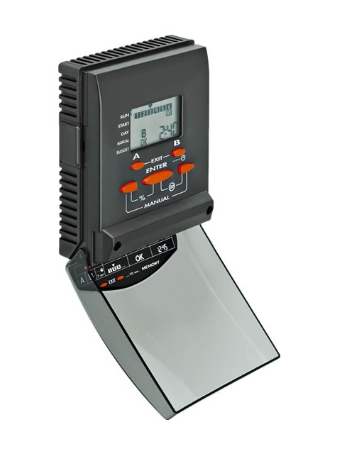 Programmatore automatico a una via. Effettua fino a due irrigazioni al giorno. Ha solo tre tasti per programmare con facilità. Il display di grande formato comunica chiaramente con simboli e numeri tutte le informazioni necessarie.