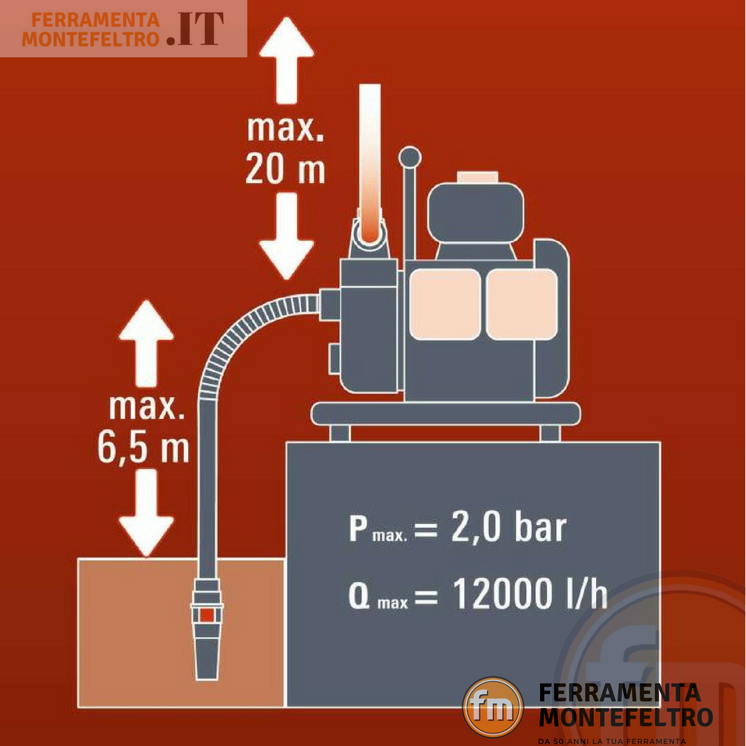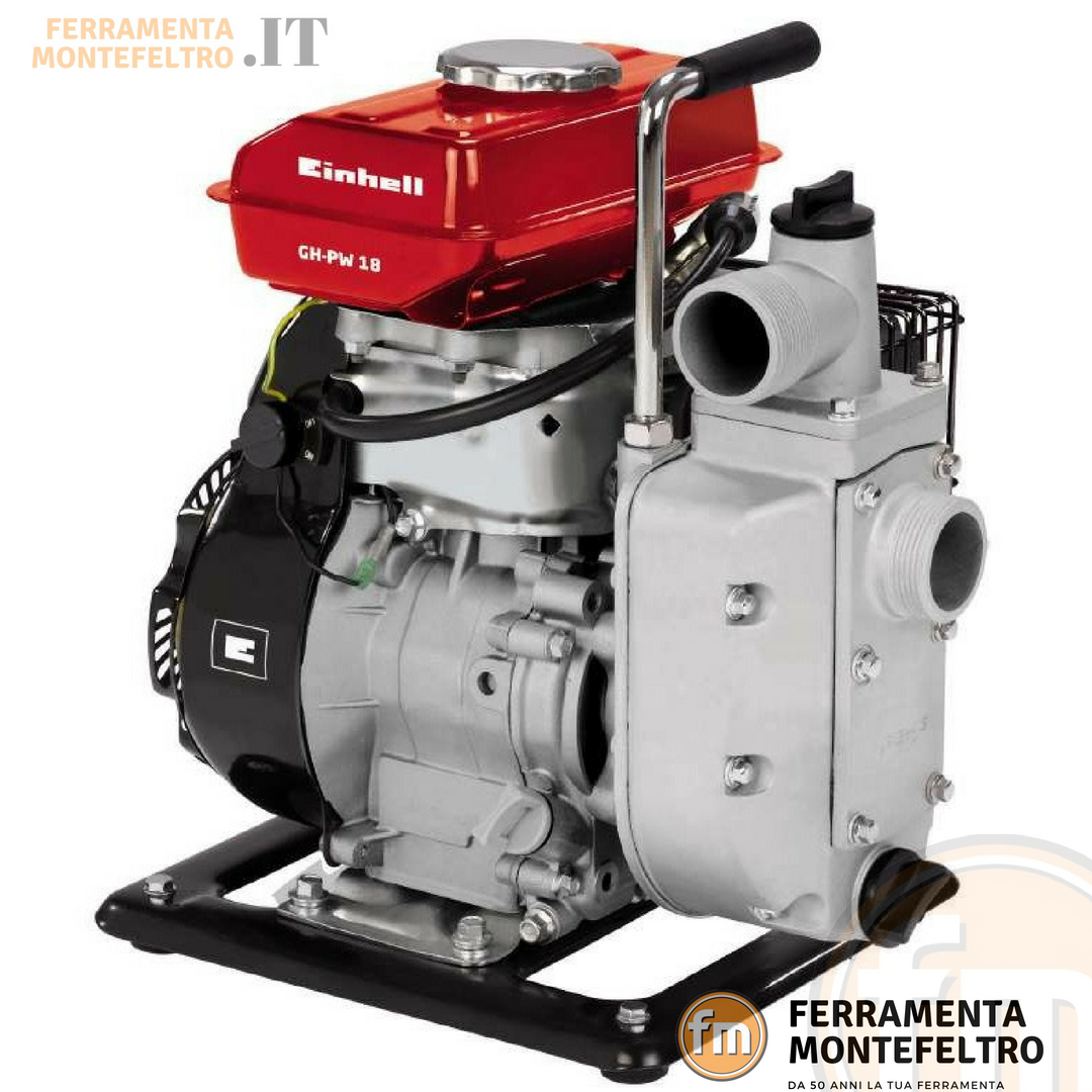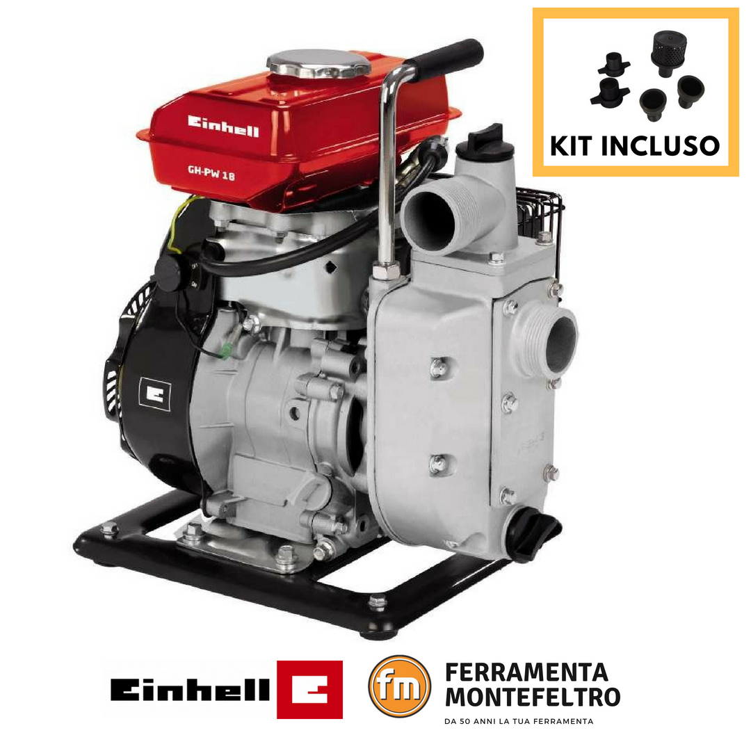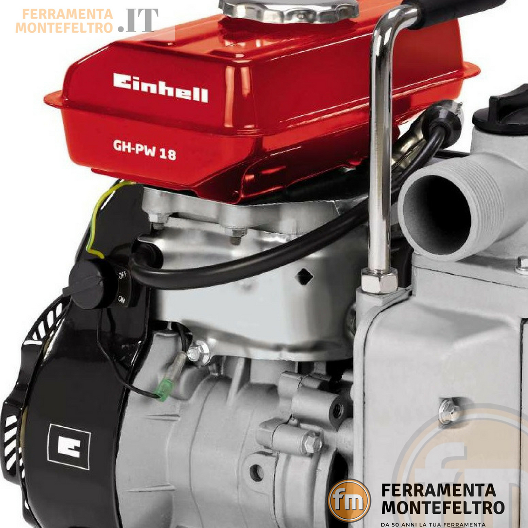 Il motore a quattro tempi da 1,8 kW eroga una coppia sufficiente a pompare fino a 200 litri al minuto, con una prevalenza massima di 20 metri. Collegamento di uscita e di aspirazione sono dotati di una filettatura esterna G1½. Grazie al telaio in acciaio la motopompa GH-PW 18 rimane ferma e sicura. La pompa dispone di un serbatoio da 1,4 litri che consente periodi di funzionamento maggiori. Per un comodo riempimento la pompa è fornita di un tappo di riempimento, l'acqua residua può essere scaricata dalla pompa dopo l'uso tramite la valvola di sgocciolamento. Pratica impugnatura per il trasporto. La fornitura comprende 2 adattatori da 38.1 mm (1.5") (raccordo tubo), 2 riduttori a G1.