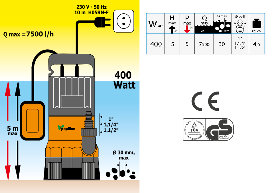 Caratteristiche tecniche Elettropompa sommergibile MORAY Pompa per drenaggio, svuotamento, travaso, piccola irrigazione. Adatta per acque sporche. 400w - 7500 l/h Art. 91852 Mod. MORAY Scarica la scheda prodotto