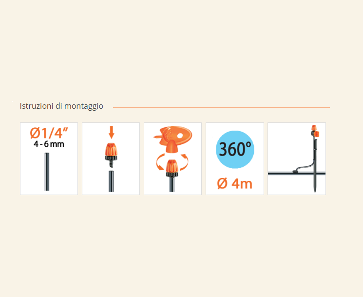 Grazie al suo design ergonomico, si installa facilmente ad incastro sul tubo collettore, sul capillare oppure sulle apposite astine, nel caso si desideri sollevarlo sopra le colture. Annaffia un’area a 360° con una pioggia delicata e uniforme