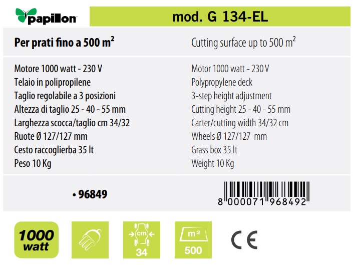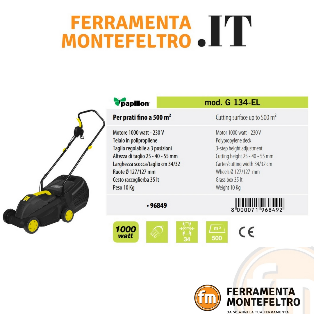 | Rasaerba elettrico "PAPILLON" 1000W - 230V - telaio in polipropilene - capacità taglio: 320mm altezza regolabile su 3 posizioni: 25/40/55mm - cesto raccoglierba da lt. 35 in plastica motore a spazzole - velocità a vuoto 3450 rpm - a norme CE |