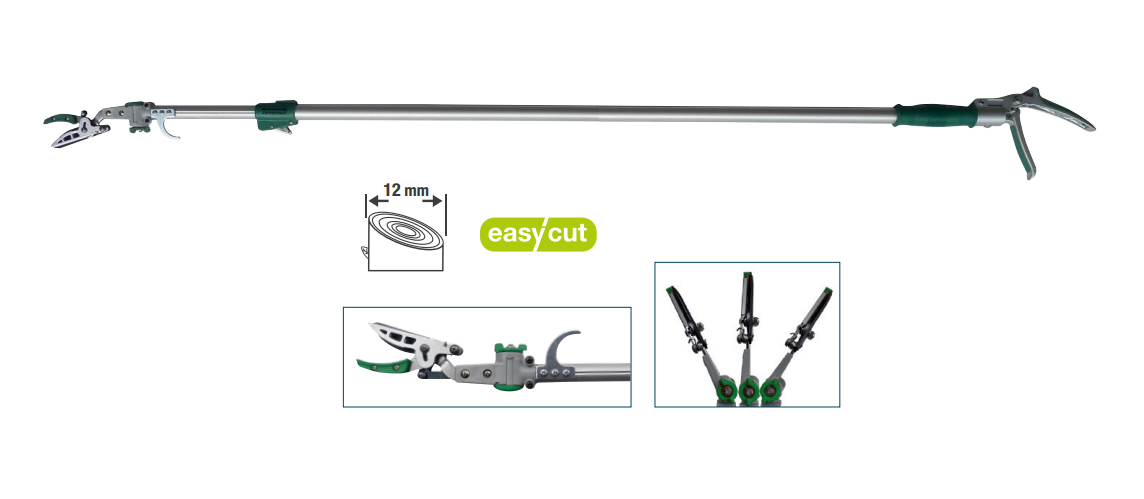 Lama Easycut in acciaio SK-5, manico in alluminio telescopico a 6 posizioni (da 190 cm a 309 cm), capacità di taglio su legno verde 12 mm, testa regolabile in 3 posizioni, con gancio.
