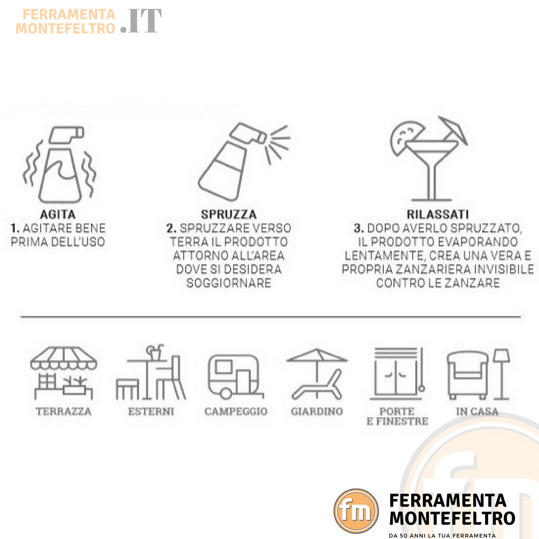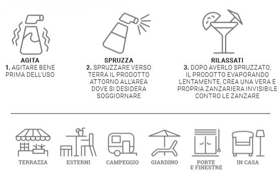 Caratteristiche: è un insetticida con azione BARRIERA: una volta spruzzato nell’ambiente il prodotto evapora formando un muro simile ad una barriera “zanzariera invisibile” che protegge chi è all’interno per circa 8 ore. Si consiglia di spruzzare circa 10-20 minuti prima di soggiornare per permettere l’attivazione della zanzariera.