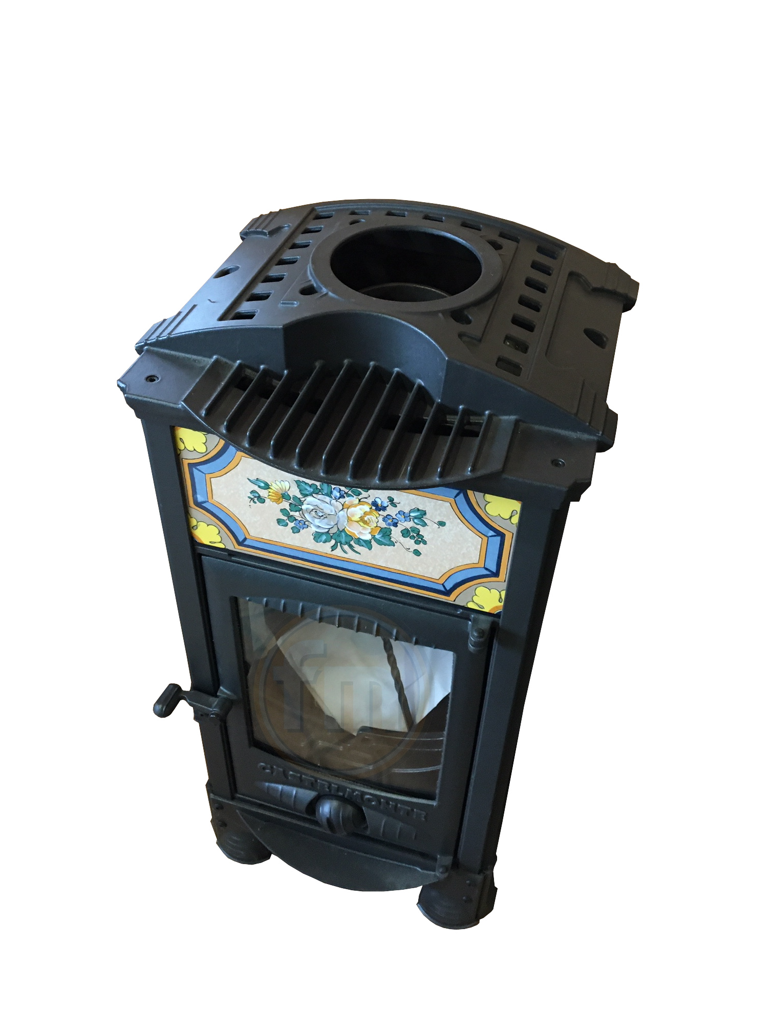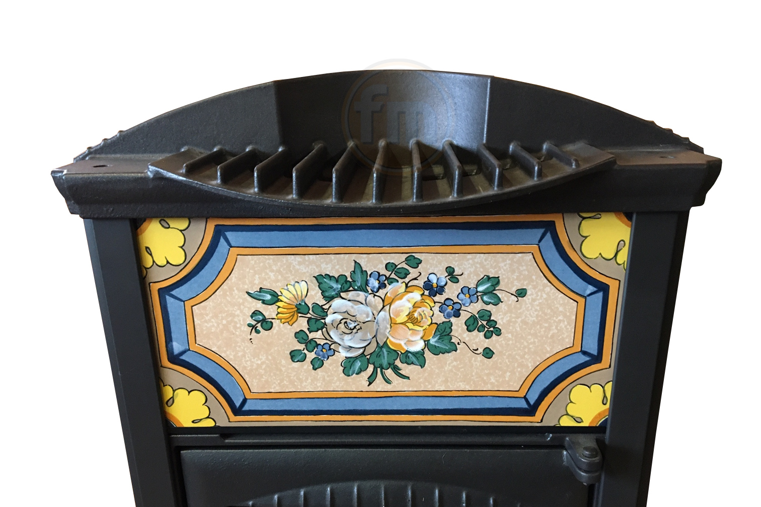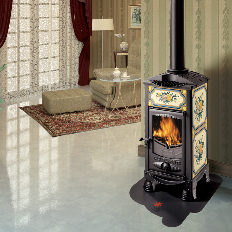 La stufa a legna castelmonte può scaldare ambienti fino a fino a 240 mc, con una capacità termica media di 7 kW, scarico fumi da ø 12 cm con maioliche decorate e struttura nera.