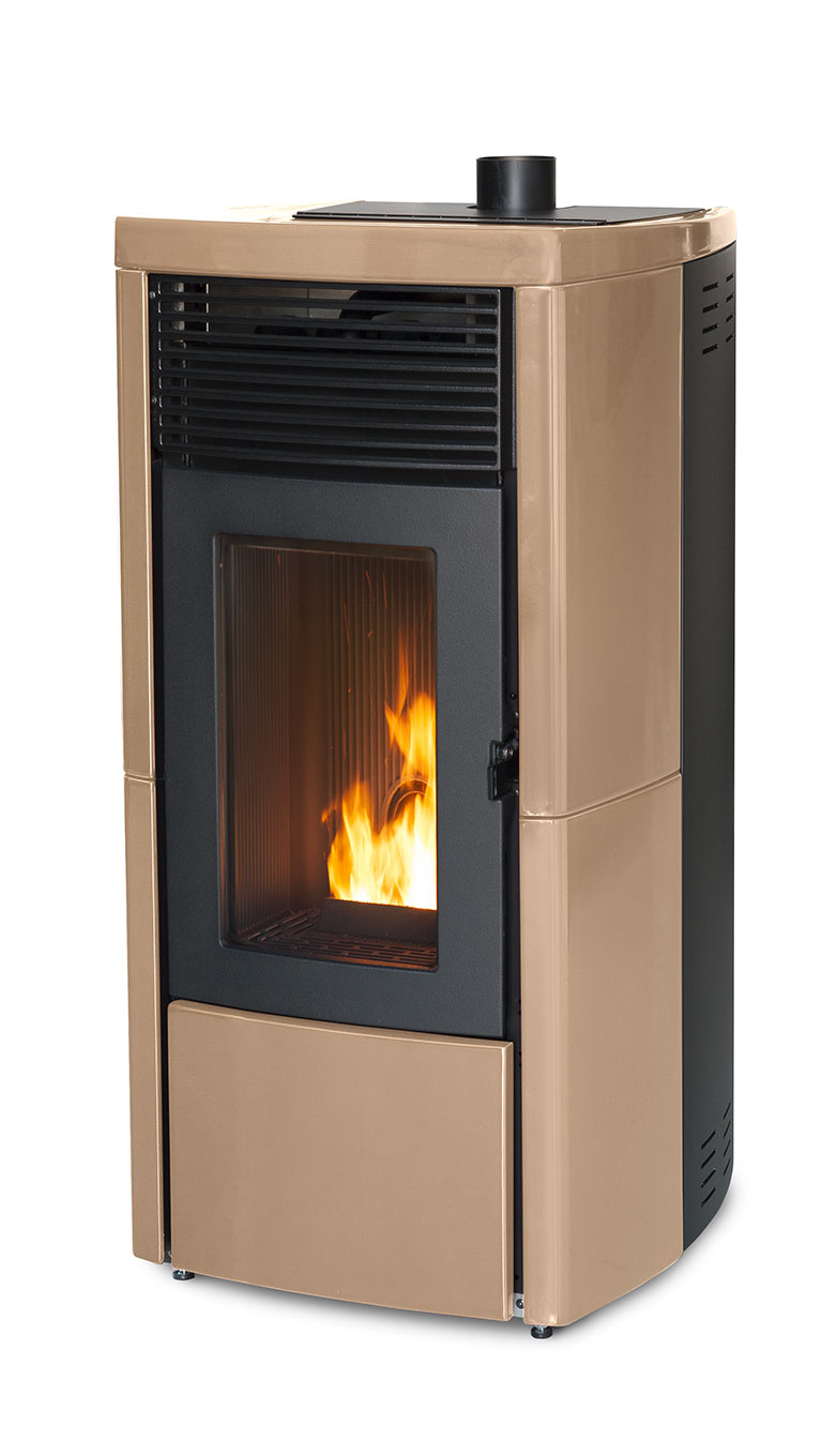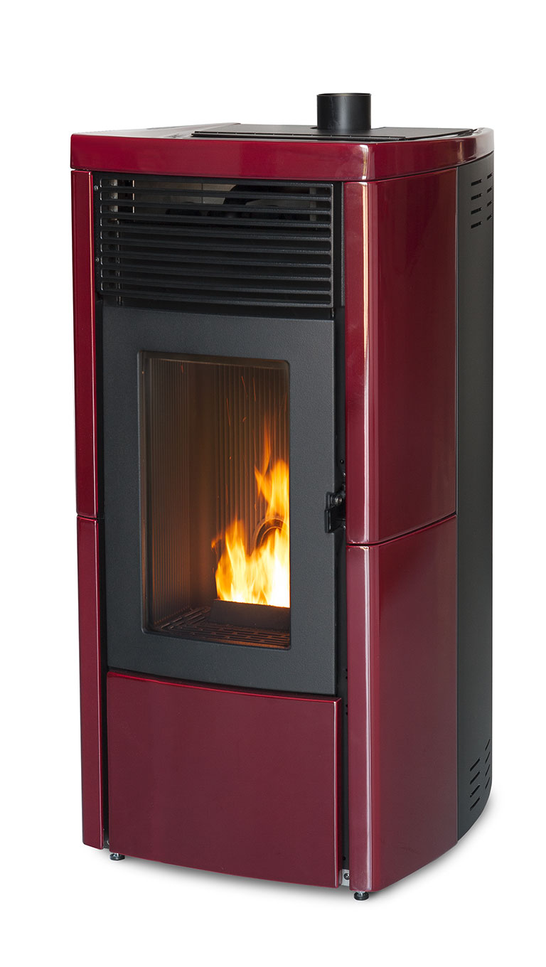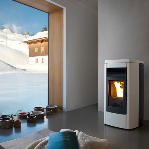 Stufa a pellet realizzata con struttura in acciaio, top e fianchi in ceramica. Braciere in ghisa. Gestione intelligente della combustione tramite Active+. Di serie il telecomando con funzione termostato ambiente.