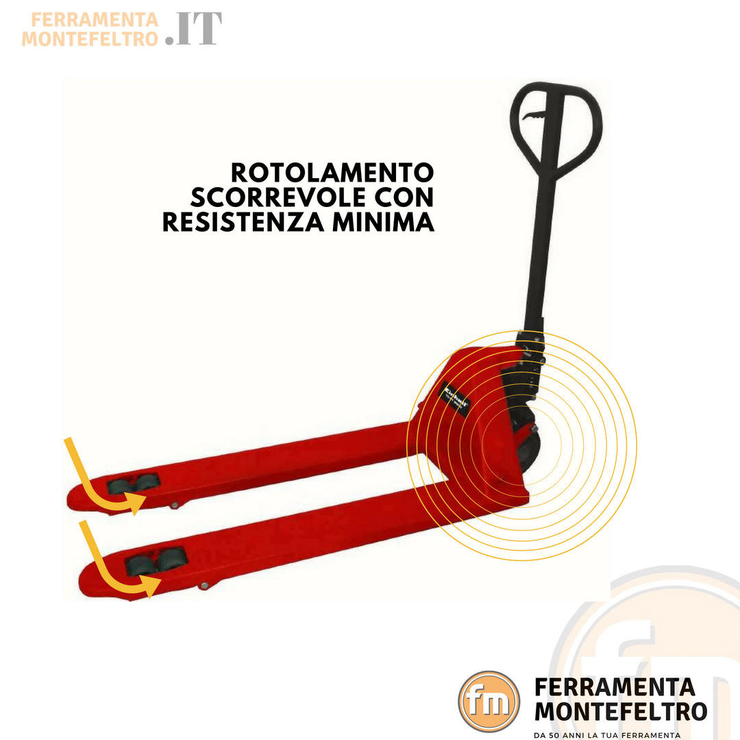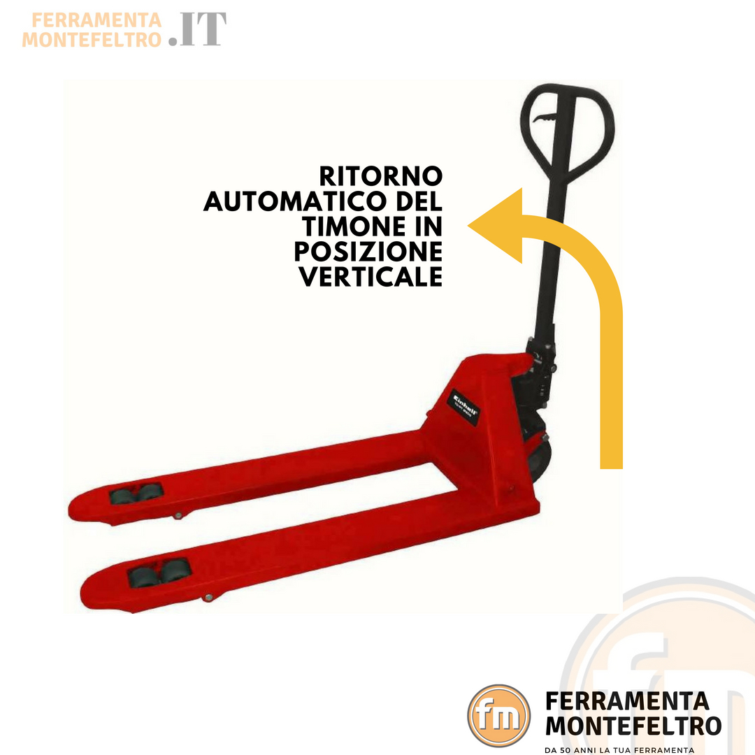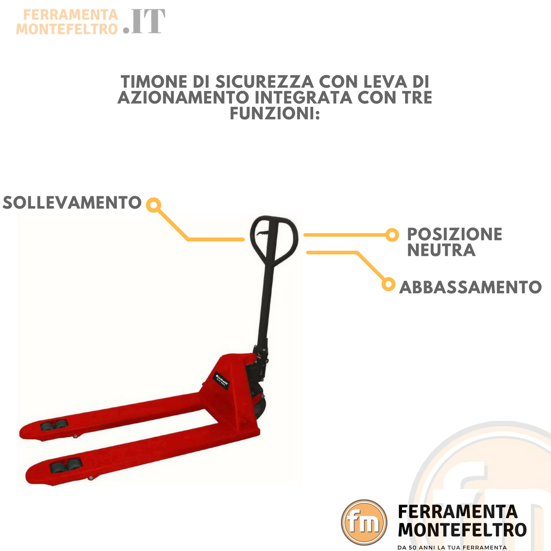 Il transpallet TC-PT 2500 è un aiutante infaticabile in officina e in magazzino nonché per i lavori di trasporto. Grazie alla sua robusta struttura con telaio in acciaio saldato, alle forche ribassate e rinforzate e a una portata massima di 2.500 kg se la cava senza alcun problema anche nelle condizioni di lavoro più dure. Il TC-PT 2500 è sicuro e facile da maneggiare grazie al timone di sicurezza con leva di azionamento integrata per le principali funzioni: sollevamento, neutra e abbassamento. Il timone è inoltre dotato di una funzione di richiamo automatico in posizione verticale, non appena la maniglia viene rilasciata. Le eccellenti caratteristiche di rotolamento e il basso grado di resistenza al rotolamento sono riconducibili alle ruote orientabili rivestite in PU e supportate da cuscinetti a sfera e ai rulli di carico.