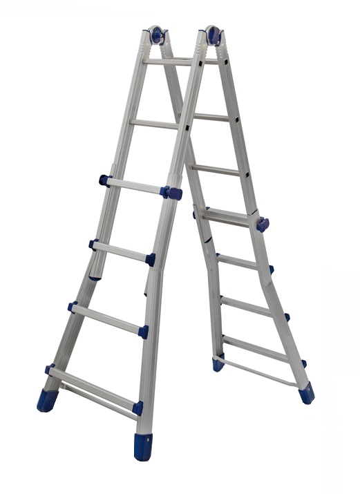 Tutta in alluminio, è una nuova scala universale. solidità e semplicità d´uso. Forti cerniere d´acciaio legano ogni montante con 18 punti di fissaggio e non permettono flessioni alla struttura.