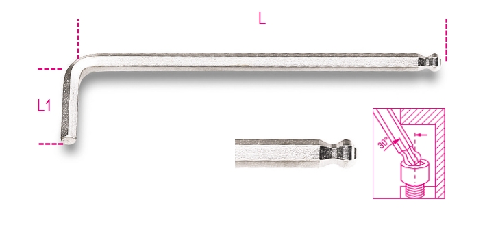 Caratteristiche tecniche Chiavi maschio esagonale piegate con estremità sferica 96BPC Chiavi con estremità sferica nelle misure: 1.5, 2, 2.5, 3, 4, 5, 6, 7, 8, 9, 10 mm. L'estremità sferica consente di operare con un'inclinazione fino a 30° rispetto all'asse della vite Per il serraggio, ove possibile, utilizzare il lato corto. Consultare la scheda prodotto nel PDF sottostante, per ulteriori informazioni e dati tecnici. Scarica la scheda prodotto